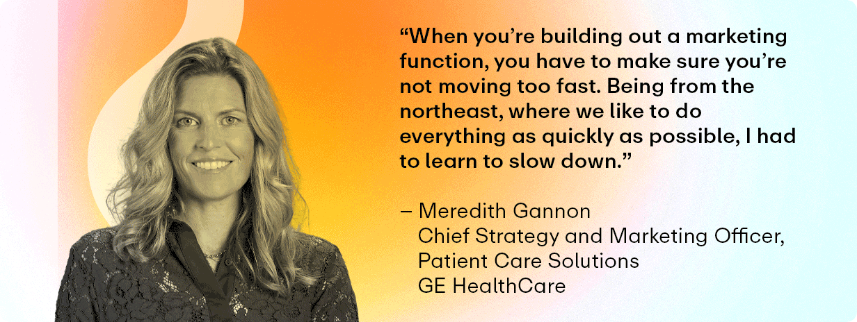She faced some challenges along the way. When Gannon arrived at GE HealthCare, marketing within the Patient Care Solutions group “was pretty much just marcomms,” she recalls. Evolving the marketing operation, then, would require concerted education around its utility and importance. Looking back, Gannon believes she might have shifted into transformation mode too abruptly.